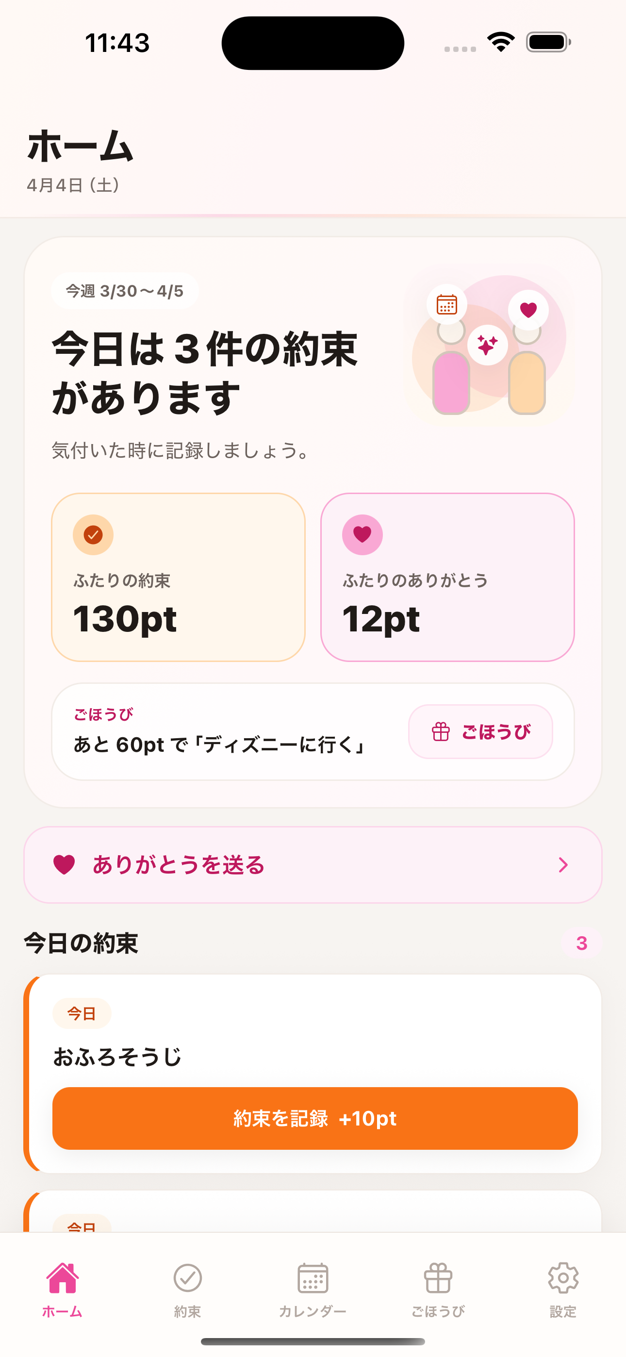 Pairlog の「約束」機能では、ふたりで決めたことを一覧で記録・管理できます。曜日ごとの繰り返し設定やリマインダー機能もあり、忘れずに続けられます。